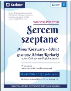Wśród naszych uczniów można znaleźć liczne talenty i ludzi z pasją. Właśnie do takiego grona zaliczamy Anię z klasy 4b, która 18 września zadebiutowała jako poetka w czasie spotkania w #bibliotecefilii53 . Zachęcamy do sięgnięcia po jej pełne magii wiersze, które wzruszają, poruszają serce a przede wszystkim pokazują jak wrażliwe potrafią był młode dusze. Aniu, gratulacje – rozwijaj skrzydła.